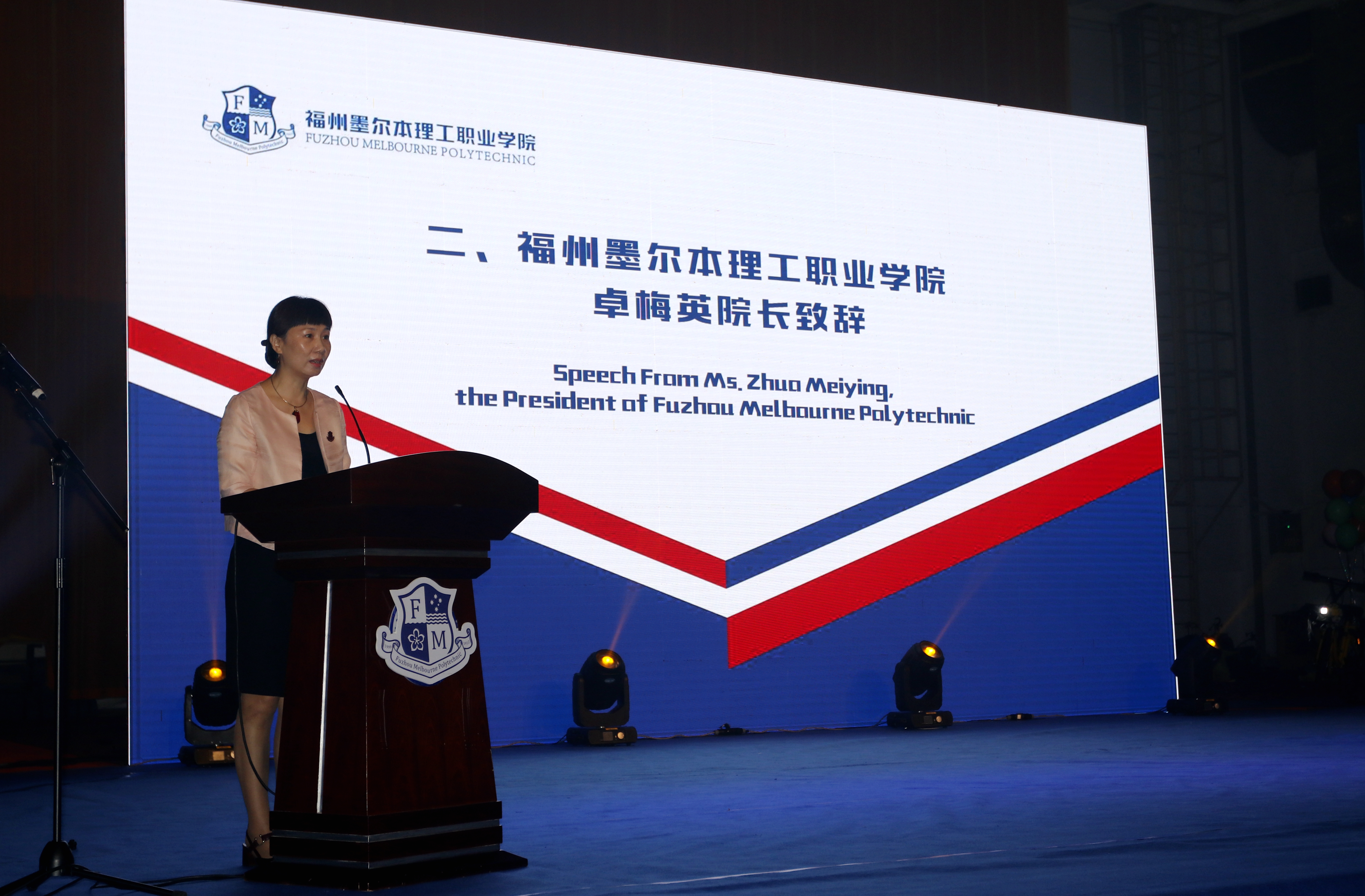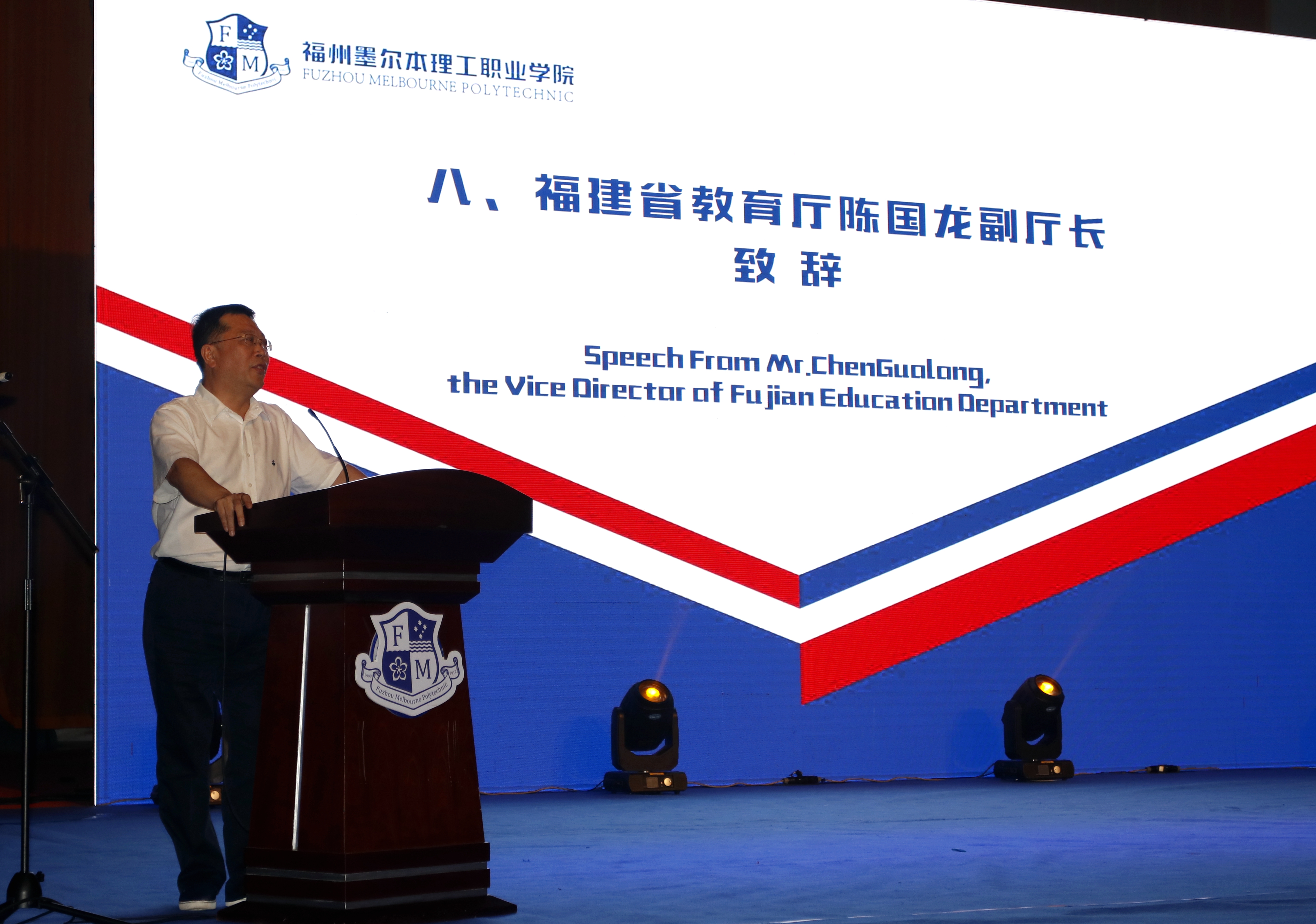 陈国龙副厅长首先欢迎祖国各地的学子们来到福州墨尔本理工职业学院学习。他代表省教育厅感谢澳大利亚墨尔本理工学院对福建高等教育的支持;感谢香港万众集团董事局主席龚清海博士对福州墨尔本理工职业学院办学的大力帮助;感谢福州墨尔本理工职业学院所有建设者对学生成长成才付出的辛勤努力。他表示,福州墨尔本理工职业学院获批成为独立设置的中外合作办学机构,这标志着我省中外合作高等教育步入新的里程碑。学院前身闽江学院爱恩国际学院已拥有18年中外合作办学历史,学院引进优质教育资源,不断提升高等教育国际化水平,为我省特别是福州市经济社会发展培养了大批国际化应用型人才。他指出,当前福建人民正在建设“机制活、产业忧、百姓富、生态美”的新福建。在“六区叠加”的战略背景下,我省急需大量优秀的国际化人才。福建省教育厅将积极支持福州墨尔本理工职业学院的发展,希望学院要坚定中外合作办学的社会主义办学方向,以师生为本,创建更加优良的国际化办学环境,不断提升办学水平;希望学院广大教师不忘初心,回归教育,为国家培育出更多的国际化栋梁之才;希望学院广大学子珍惜学院创造的国际化平台,努力成长为“又红又专”、具有国际视野、通晓国际规则的国际化人才。他祝愿福州墨尔本理工职业学院的明天更加美好。