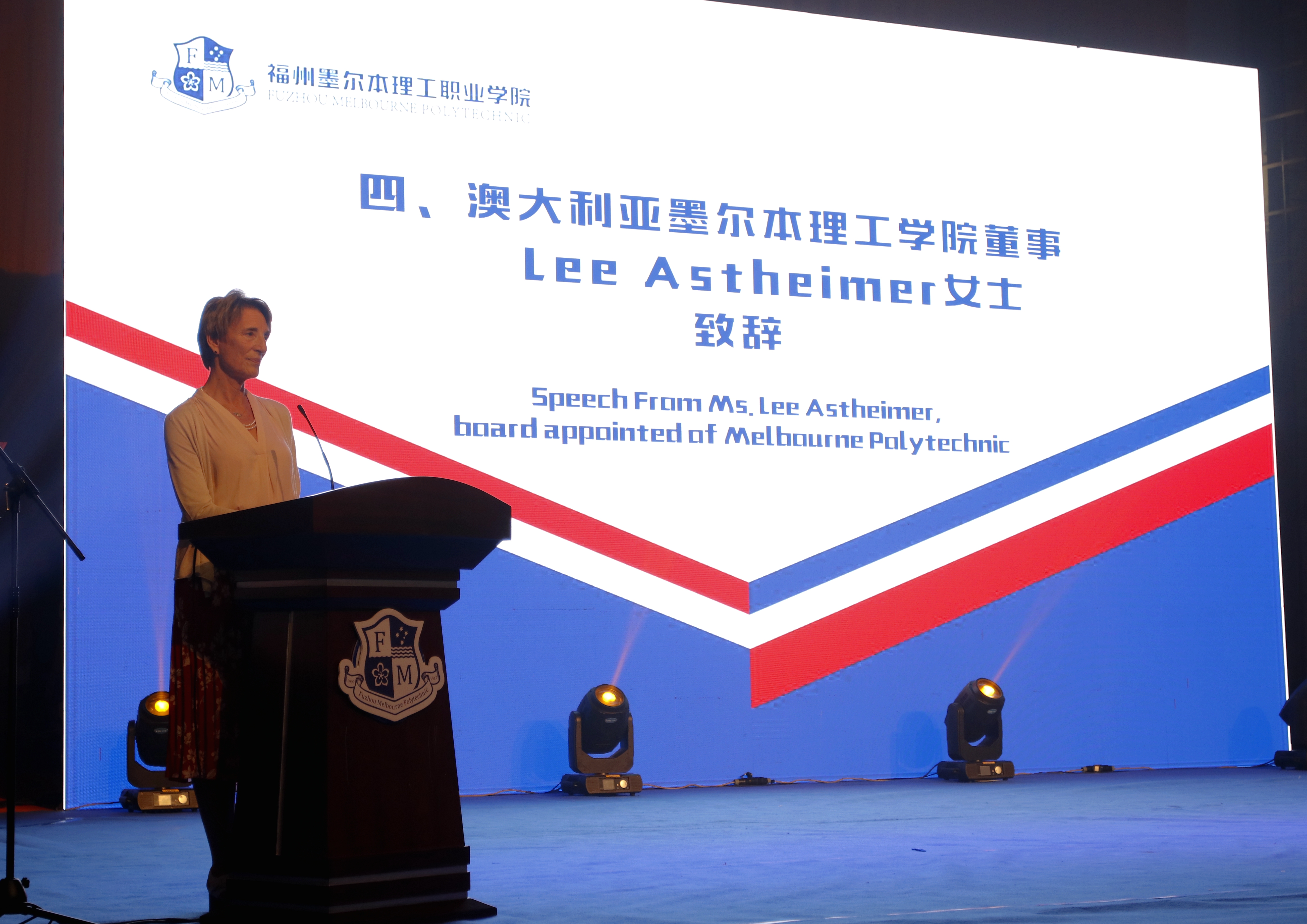 澳大利亚墨尔本理工学院董事Lee Astheimer女士在致辞中表示,墨尔本理工学院和闽江学院已有18年友好合作办学的历史,培养了数千名年轻有为的学子。未来,学院将加强沟通与合作,倾全校之力与闽江学院共同办好福州墨尔本理工职业学院。欢迎广大同学前往澳大利亚墨尔本理工学院继续深造,中澳高校携手培养更多社会经济发展需要的国际化应用型人才。