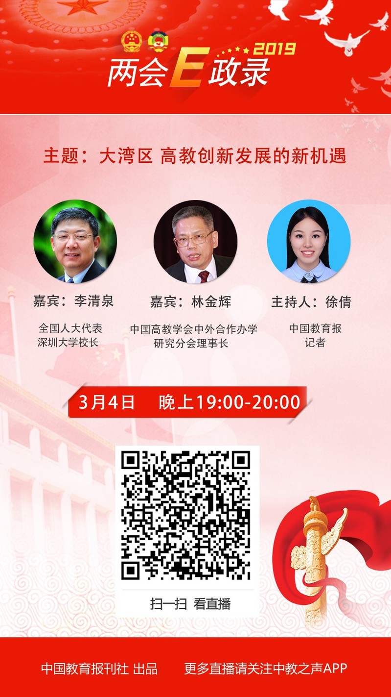 全国两会期间,3月4日晚上7点至8点,厦门大学中外合作办学研究中心(教育部中外合作办学理论研究基地、政策咨询平台和中心)主任、中国高等教育学会中外合作办学研究分会理事长林金辉教授应邀在北京的演播厅接受“两会E政录”专题访谈直播,畅谈中外合作办学和粤港澳大湾区高等教育融合创新等问题。